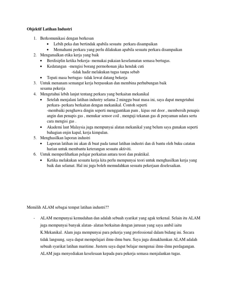 Antara objektif yang dapat ditakrifkan dan diketahui dalam melakukan laporan latihan industri ini adalah seperti berikut Objektif utama laporan latihan industri adalah untuk merekod / mencatat tugasan yang telah diberi ke dalam jurnal refleksi. Amir syazwan bin latfi amir. Setelah menamatkan sesi latihan industri ini setiap pelajar mesti menyiapkan satu buku laporan lengkap. Pelajar yang tamat menjalani latihan industri diwajibkan menyediakan satu laporan latihan industri.